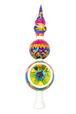 As if lifted from an opera set or the ceiling of a palazzo, this finial bursts with gold flourishes, jewel-toned whirls, and a confetti of high drama. The reflector at its center beams in technicolor, anchoring the spectacle with a dose of Italianate splendor.