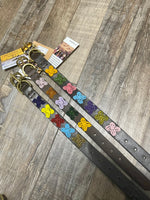 Introducing The Flower Power Beaded Dog Collar: featuring vibrant flower patterns in a dazzling array of rainbow colors, all meticulously beaded onto rich brown leather. This collar combines playful floral designs with a spectrum of hues, creating a lively and eye-catching accessory that adds a burst of color and charm to your pet’s look.