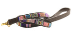 Introducing The Posey Beaded Dog Lead: featuring a charming design inspired by a spring flower bed, with soft, vibrant colors in vertical stripes and sunburst circles. The lead showcases beautiful shades of pink, red, green, and yellow, all set against rich brown leather. This lively combination of colors and patterns adds a fresh and playful touch, perfect for brightening up your dog’s look.