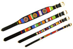 Introducing The Circle of Life Beaded Dog Collar: featuring a vibrant design of primary colors arranged in dynamic circles and vertical stripes on sleek black leather. This eye-catching collar celebrates life's vibrant energy and rhythm, adding a bold and lively touch, making them a perfect accessory for your beloved pet.