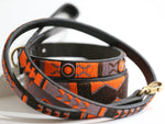Introducing The Marula Beaded Dog Collar: Featuring a playful blend of orange and mauve beads, set against a classic brown leather base. This unexpected color combination adds a fun and distinctive touch, while the leather provides a durable and stylish foundation.