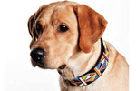 Introducing The Primary Beaded Dog Collar: featuring a vibrant design with bold primary colors—red, blue, and yellow—arranged in random geometric patterns. Set against a rich brown leather base, this collar combines striking colors and shapes for a lively, modern look that adds a touch of flair to your dog's style.