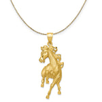 As a symbolic symbol, meaningful totem, or just because you love horses this 14k yellow gold pendant is a winner. It features a two-dimensional open back design with a polished and satin finish accented with diamond-cut details. Approximate size, 18mm (11/16 inch) in width by 51mm (2 Inch) in length, which includes the tapered bail. The pendant is . Includes a 0.8mm 14k yellow gold cable chain with a lobster clasp.