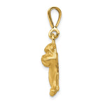 Warm your heart and elevate your style with a fashionable dog charm featuring your favorite breed. This compact docile dog captured in 14k yellow gold features a two-dimensional, open back design with a satin and diamond-cut finish. It measures approximately 18mm (11/16 inch) in width by 27mm (1 1/16 inch) in length, which includes the tapered bail. Made in the U.S.A. Chain not included.