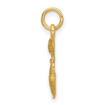 Solid 14k yellow gold design Satin finish with diamond-cut details Approximate charm size 10 x 18mm Average weight is 0.95 grams