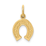 Tie the meaning to the moment with a classic or unusual pendant that makes it personal, thoughtful, or meaningful. This patterned horseshoe charm crafted in 14k yellow gold features a satin and polished finish. The approximate size is 10mm (3/8 inch) in width by 20mm (3/4 inch) in length with the jump ring. This item does not include a chain.