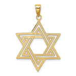This six-point star is the central symbol for Judaism. Crafted from 14 karat gold featuring a diamond-cut and satin finish. Pendant measures 1 Inch. Chain not included.