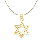 This six-point star is the central symbol for Judaism. Crafted from 14 karat gold featuring a diamond-cut and satin finish. Pendant measures 5/8 Inch. Includes a 0.9mm wide, solid 14k yellow gold cable chain with...