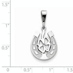 Tie the meaning to the moment with a classic or unusual pendant that makes it personal, thoughtful, or meaningful. This four leaf clover and horseshoe pendant is available in 14k yellow or white gold and features a polished and textured finish. The approximate size is 15mm (9/16 inch) in width by 29mm (1 1/8 inch) in length with the bail. This item does not include a chain.