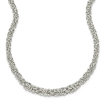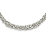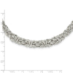 Crafted with sterling silver 6.5 mm in width and 17 inches in length Hollow link, graduated Byzantine style chain Average item weight is 21.6 grams