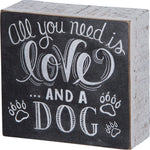 A black and white wooden chalk art box sign featuring a hand-lettered "All You Need Is Love... And A Dog" sentiment with paw print designs. Great to gift and easy to hang as a unique gallery wall accent or can free-stand alone on a shelf, mantel, or desk. From our Primitives by Kathy collection.