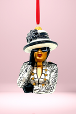The Coco White ornament exudes poise with its monochrome palette and intricate detailing. Her tailored white jacket, kissed with black embroidery, speaks of classic sophistication, while her dark sunglasses conceal untold stories. She is grace, power, and rebellion wrapped in couture.