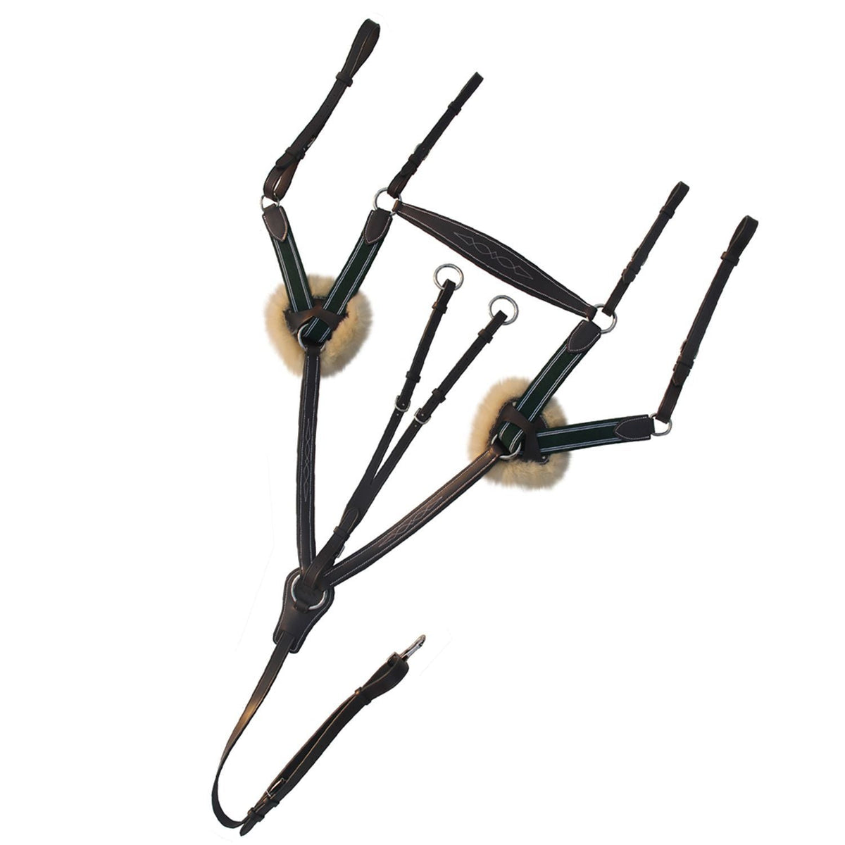 The 5-point design will naturally distribute the pressure over a larger area than a breastplate with just a couple of points of contact. It could also be said that 5-point breastplates don’t put as much pressure on the tree of the saddle when the rider jumps. Use of original Sheep skin and green Elastic and white Lines leather amalgamated inserts at the shoulder.