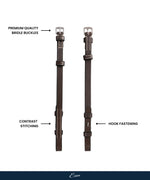 Featuring robust stainless steel hardware, these cheekpieces withstand the rigours of equestrian life, providing a secure and durable connection. The bridle buckles not only secure the fit but also add a touch of sophistication to your horse's tack ensemble.