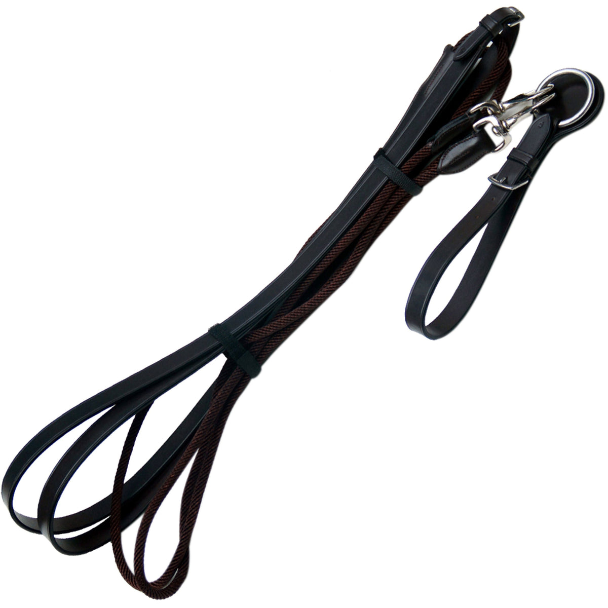 This is a beautiful training aid as these leather and nylon draw reins are 19mm wide and 7' long crafted in fine leather and strong cord with snaps on both ends for easy fastening with a protected buckle guard. These leather draw reins with cord are widely accepted and are great-looking.
