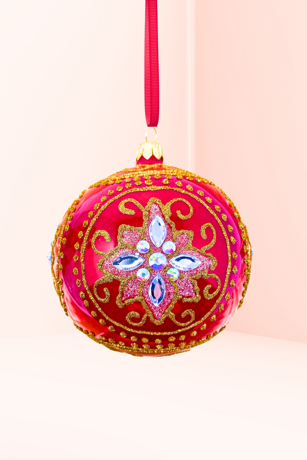 Burning garnet red, kissed with gold, gleams like the corridors of Florence at twilight. Adorned with intricate flourishes and faceted gems, this bauble exudes the presence of an heirloom, a relic of aristocratic indulgence. An ornament, yes—but also a declaration.