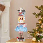 Hollywood Nutcrackers is a whimsical collection of nutcrackers created exclusively for Kurt S. Adler, Inc. and features an assortment of designs that put a unique, vibrant, memorable twist on traditional nutcrackers. This 19.5-Inch Alice Nutcracker is inspired by Lewis Carroll's 1865 novel Alice's Adventures in Wonderland. Alice is featured here with a tea set and topped off with a black-and-white diamond patterned top hat. Cheshire cat is peeking out of the hat. This nutcracker is a stunning addition to any holiday décor. This nutcracker is for decorative use only.