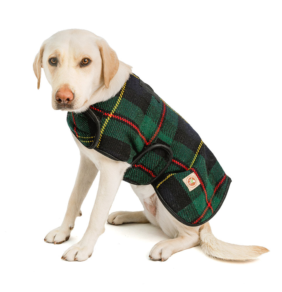 A classic plaid dog blanket coat navy, red, green and is perfect for chilly days.