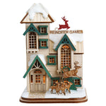 Reindeer Games has a small hole on its underside designed to borrow a standard bulb from your tree to light up the cottage. Upon lighting your cottage, you will immediately discover the first of many secrets, the beautifully crafted scene inside. Can you find Santa joining the fun? How many chess men can you find?