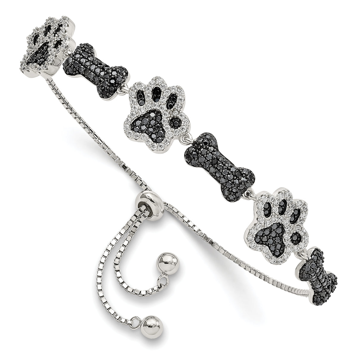 Delightful and elegant sterling silver paw and bone CZ bracelet will bring a smile to a dog mom’s face. Loaded with triple quality black and white Cubic Zirconia (CZ) stones will add shimmer and luster to any dog lover’s wrist. Enjoy this paw bracelet for years because it’s Rhodium plated to preserve the silver luster as it shines forever. Adjustable dog bone bracelet is on a box chain to fit larger wrists and hands that are 9” around.