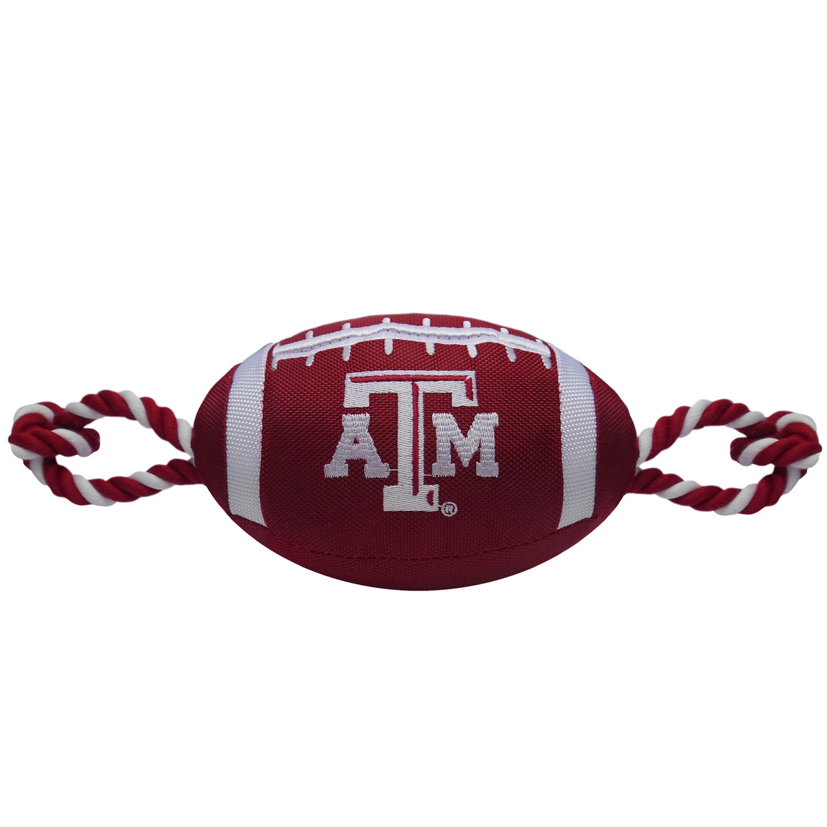 Nylon football toy has an embroidered college team logo, squeaker and contrast tug rope. Great fun for you and your pet!