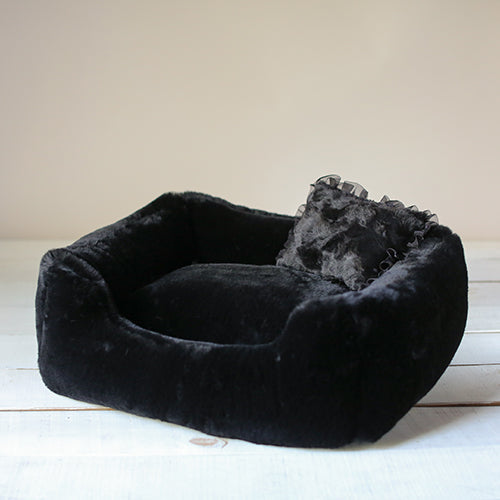 The Divine Dog Bed Black offers irresistibly cozy. Hello Doggie is excited to debut our new luxurious Divine Bed. Made with only the softest, most luxurious high-end fabric, any pup would dive right into this bed to enjoy a long slumber. The overstuffed pillow allows your pampered pooch to sink into bliss while the low bolster front allows for easy access. The Divine Bed is machine washable in cold water with mild detergent on a delicate cycle, air dry or air fluff with no heat but for best results we recommend dry cleaning.