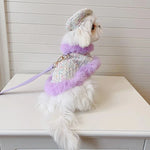 Ooh la la! Dress your dog in Parisian style with our Tres Chic Lilac Tweed Coat, Beret Cap & Leash Set. This elegant handmade set features a stylish faux-fur-lined pullover cape in a rich cotton wool blend, ensuring your dog stays warm and fashionable. The beret cap adds a classic touch, perfect for any posh outing.