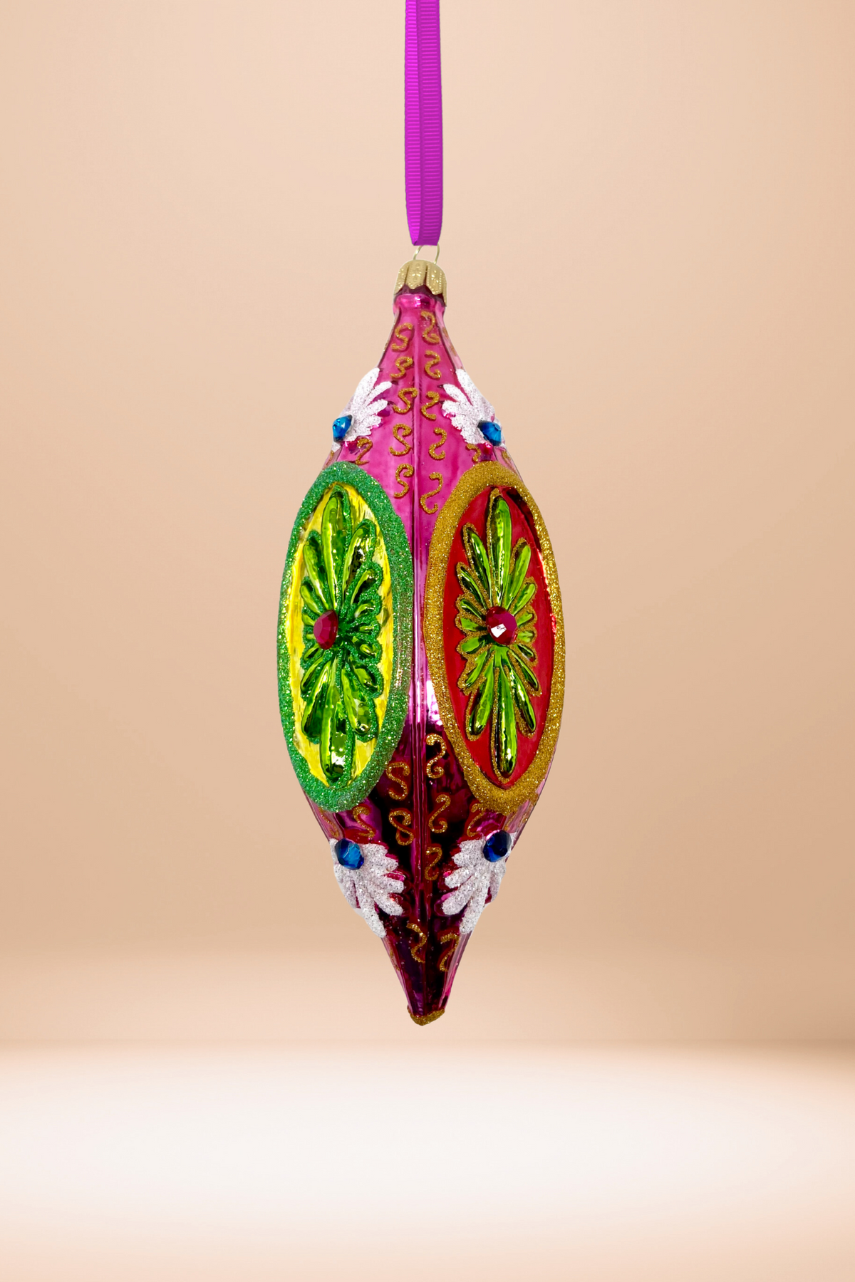 A kaleidoscope of vintage glam with reflector eyes that see it all. Encrusted with florals and coin-like medallions, she’s a tribute to the city of lights and the thrill of the win.