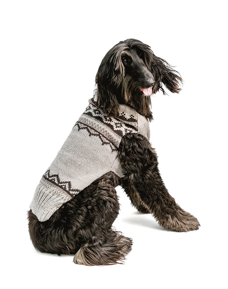 Beautiful grey tones in a classic fair isle pattern make this soft alpaca sweater a best seller! This pattern looks great on both male and female dogs!