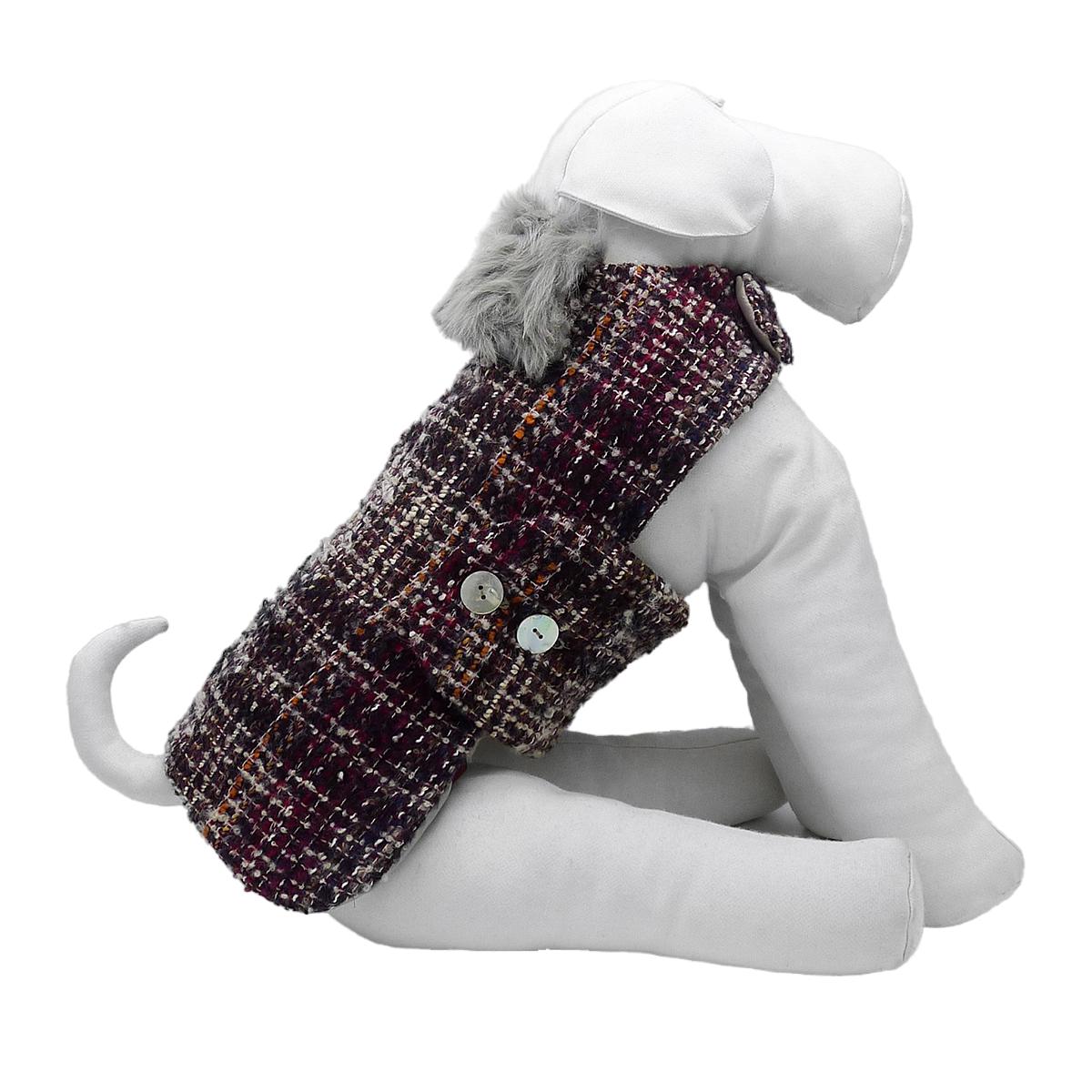 This double-faced/down dog coat is made in a designer fabric in shades of wine red and pearl grey with a waterproof pearl grey side. The girth band has buttons for closure in natural mother-of0pearl and a pearl grey faux fur collar. The dog jacket is completed with a grey wool patch on the back which allows you to store poop bags or treats. The inner side is a waterproof pearl grey technical fabric. In case of rain, the garment is easily reversible. The padding in technical material ensures maximum protection from cold weather. Dry Clean Only. Made in Italy. For this bespoke dog coat, you can also choose a version with double padding that makes it a very warm down jacket to face even the coldest winters. Made To Measure: Exclusive handmade clothing item expressly tailored to order. Please enter all measurements. Length : Distance between the base of the neck and the base of the tail. Neck : Neck circumference. Chest : Chest circumference at its widest point. Buttonhole : In case your dog doesn't wear a conventional collar but prefers a harness, please tell us the exact distance between the base of the neck and the center of the harness's dorsal ring, as well as its diameter. We also need to know if the harness's ring is parallel or perpendicular to the backbone for perfect execution. Please allow 3-4 weeks for delivery as this item ships directly from the designer in Italy. This item is made to measure, therefore, is not eligible for return/exchange.