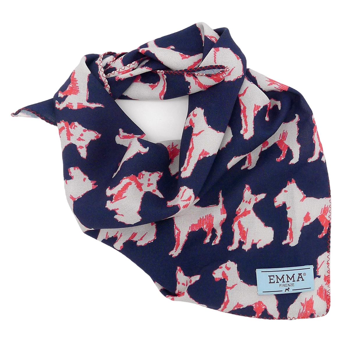 This navy blue viscose dog bandana has a coral-colored allover graphic design representing our beloved puppies. The pattern is distributed over the entire surface and it is edged with coral-colored zig-zag stitching. Hand wash. Made in Italy. Size: approx. 17.7" x 17.7" (for neck circumference up to 19.7") Please allow 2-3 weeks for delivery as this item ships directly from the designer in Italy.