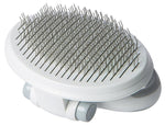 The Pet Life ® 'Gyrater' Travel Self-Cleaning Swivel Pet Slicker Brush features a Built-in customizable rotating handle hinge that both swivels and locks into place at the press of a button to your desired handle setting. This Brush offers both a Palm and Knuckle Handle grip options and features a contoured inner grip with a Rubber-like TPR material for added grip and comfort while brushing. Designed to place less Stress on the hands and wrists during usage. Features an ejectable button located on the reverse that neatly ejects shedded hair follicles that make disposal of hair convenient. The Wired and Flexible Stainless Steel Pins are designed to smoothen their coat and remove Knots and Tangles and is the perfect length for both Dog and Cat Medium Hair and Long Hair Breeds especially those with curly hair. Small and Compact make it perfect for Travel.