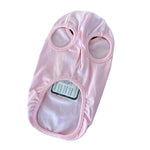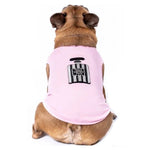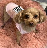 Made of 100% Pima cotton, this designer-inspired embroidered dog T-shirt by Aventura Pups features a Chewnel black-and-silver striped perfume bottle on a light pink T-shirt. Available in 4 sizes, S-XL for small dogs.