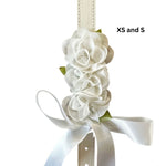 Perfect for weddings, these stunning white silk flowers on a faux white leather collar feature a matching white satin bow. Handmade in the USA by Chloe & Max, these collars come in 3 sizes XS, S and M. The XS and S feature small flowers, the M comes with a large flower.