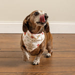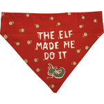 This Primitives by Kathy reversible cotton linen blend collar bandana features "Every Cookie You Bake I'll Be Watching You" sentiment and Christmas cookie designs on one side, and "The Elf Made Me Do It" sentiment with elf shoe and polka dot designs on the other. Bandana slides around standard collars to easily change designs. Machine-washable. For small to large breed dogs.