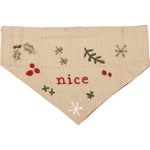 This Primitives by Kathy small reversible cotton linen blend collar bandana features an embroidered "Naughty" sentiment and holiday botanical designs on one side, and "Nice" sentiment with holiday botanical designs on the other. Bandana easily...