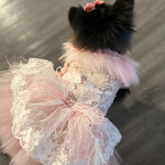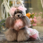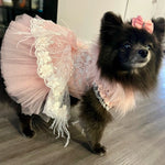 Designed for Posh Dog Life, our handmade Sophia Dog Party Dress is exquisitely crafted with the finest details, including frills such as feathers, embroidered floral lace, faux-pearl applique flowers and a tulle skirt. This luxurious pink dog dress is for weddings, anniversaries, photoshoots and special occasions.