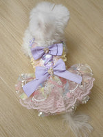 Make your furry friend the star of every occasion with this luxury princess dog dress. Designed with pastel rainbow lace, sequins, and layered ruffles, it brings out a fairytale charm. The two lavender bows with jewel accents create an eye-catching, elegant look.