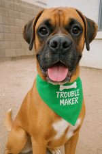 The Parisian Pet 'Trouble Maker' Bandana is the perfect way to add a fun, stylish flair to your furry friend's wardrobe. Designed for dogs and cats, this comfortable green bandana is made from soft, high-quality fabric that ensures all-day wear without irritation. Whether you're looking for a playful accessory for your pet or something to make them stand out, this trendy green pet fashion accessory will certainly do the trick.