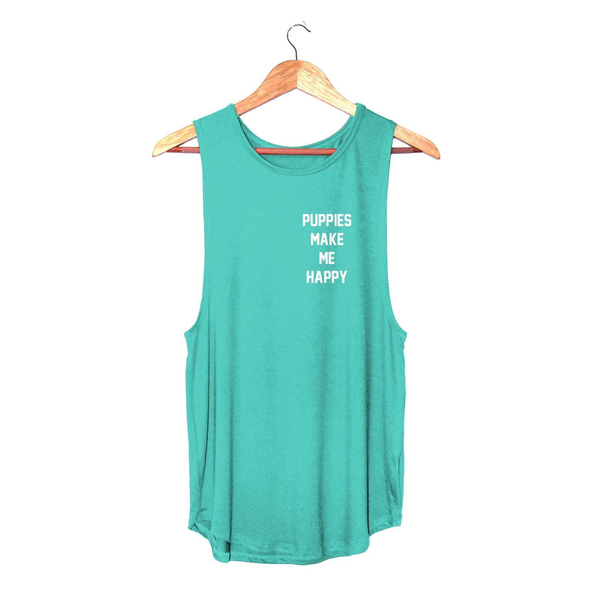 Our Motto PUPPIES MAKE ME HAPPY Printed Small over the Chest of our Best Selling Women's Sleeveless. Printed on a custom cut-and-sew sleeveless shirt with the world's softest material ever made, our Puppies Soft Fabric....
