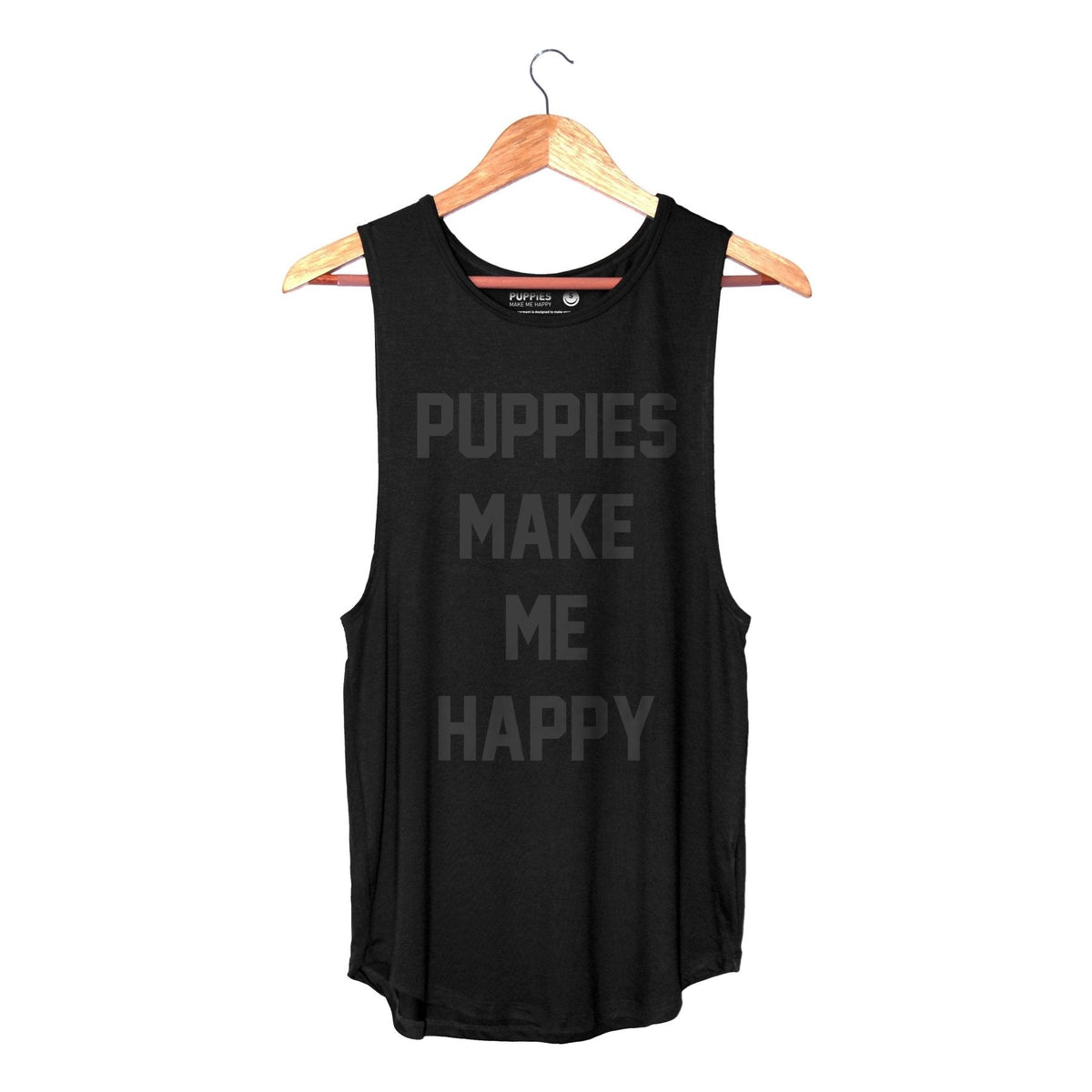PUPPIES MAKE ME HAPPY Printed with BLACK FOIL on our Black Puppies Soft Sleeveless. So Soft you will want to Pet Yourself
