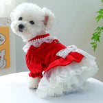 Perfect for holiday parties, this elegant Red Velvet dress with a layer lace skirt and neckline is tastefully designed with white beaded necklace trim for extra glam. Fits small and medium dogs.