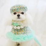 Ooh la la! Dress your beloved pet in Parisian style with our Tres Chic Aqua Tweed Coat, Beret Cap & Leash Set. This elegant handmade set features a stylish faux-fur-lined pullover cape design in a rich cotton wool blend, ensuring your dog stays warm and fashionable. The beret cap adds a classic touch, perfect for any posh outing.