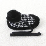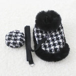Ooh la la! Dress your beloved dog in Parisian style with our Tres Chic Black Houndstooth Coat, Beret Cap & Leash Set. This elegant handmade set features a stylish faux-fur-lined pullover cape design in a rich cotton wool blend, ensuring your dog stays warm and fashionable. The beret cap adds a classic touch, perfect for any posh outing.