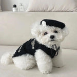 Super chic, our Chic Chanel-esque Hat & Dog Dress set is handmade and features a stylish woven-tweed dress in black or off-off white. The beret cap, adorned with a rose flower, adds a classic touch, perfect for any posh outing.