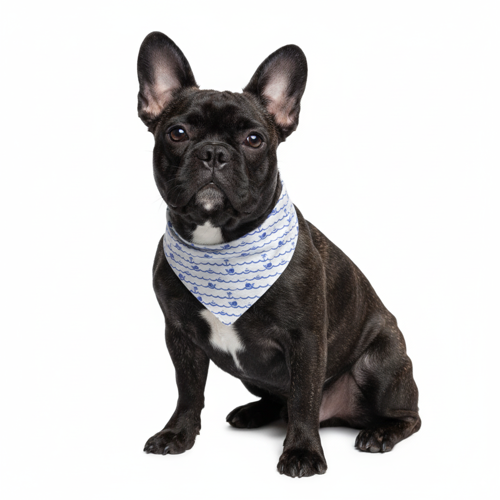 Whale, boat, and palm tree, over waves pattern design. Navy blue and cool gray. Dogo Pet Bandanas are soft high quality dual-layered. With a convenient tie-on design, these bandanas eliminate the need for buckles, making...