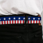 BD Wings Logo CLOSE-UP Full Color Black Silver Seatbelt Belt - Americana Stars & Stripes2 Blue/White/Red/White Webbing