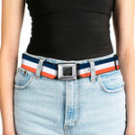BD Wings Logo CLOSE-UP Full Color Black Silver Seatbelt Belt - Stripe Navy/White/Orange Webbing