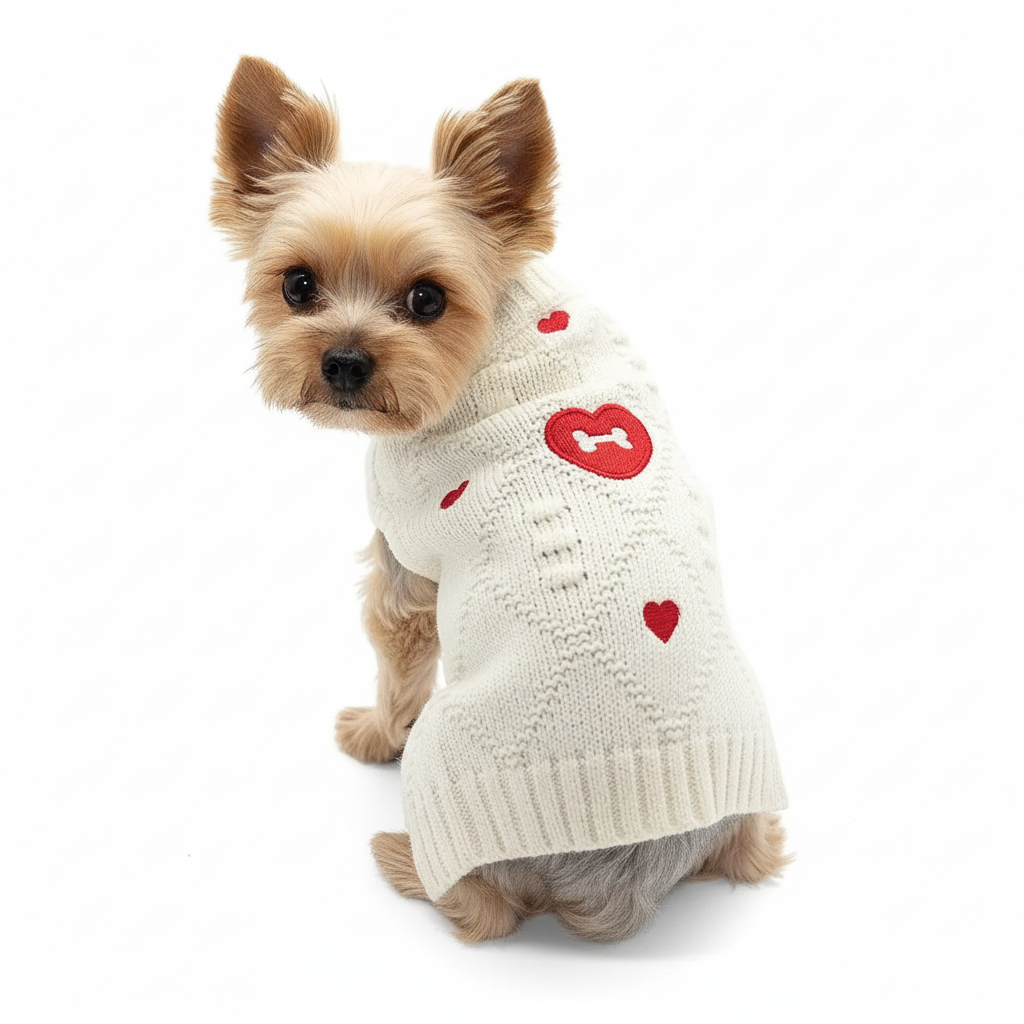 Keep your furry friend warm and stylish with this adorable cream-colored dog sweater. The sweater features a charming design with red hearts and a large central heart showcasing a bone, making it perfect for showing your pet some love. Made from a soft and comfortable knit material, this sweater provides warmth during chilly days while ensuring your dog looks cute and fashionable. The ribbed neck, hem, and leg openings ensure a snug fit, making it easy to put on and take off. Ideal for everyday wear or special occasions, this sweater is a must-have addition to your dog's wardrobe.
