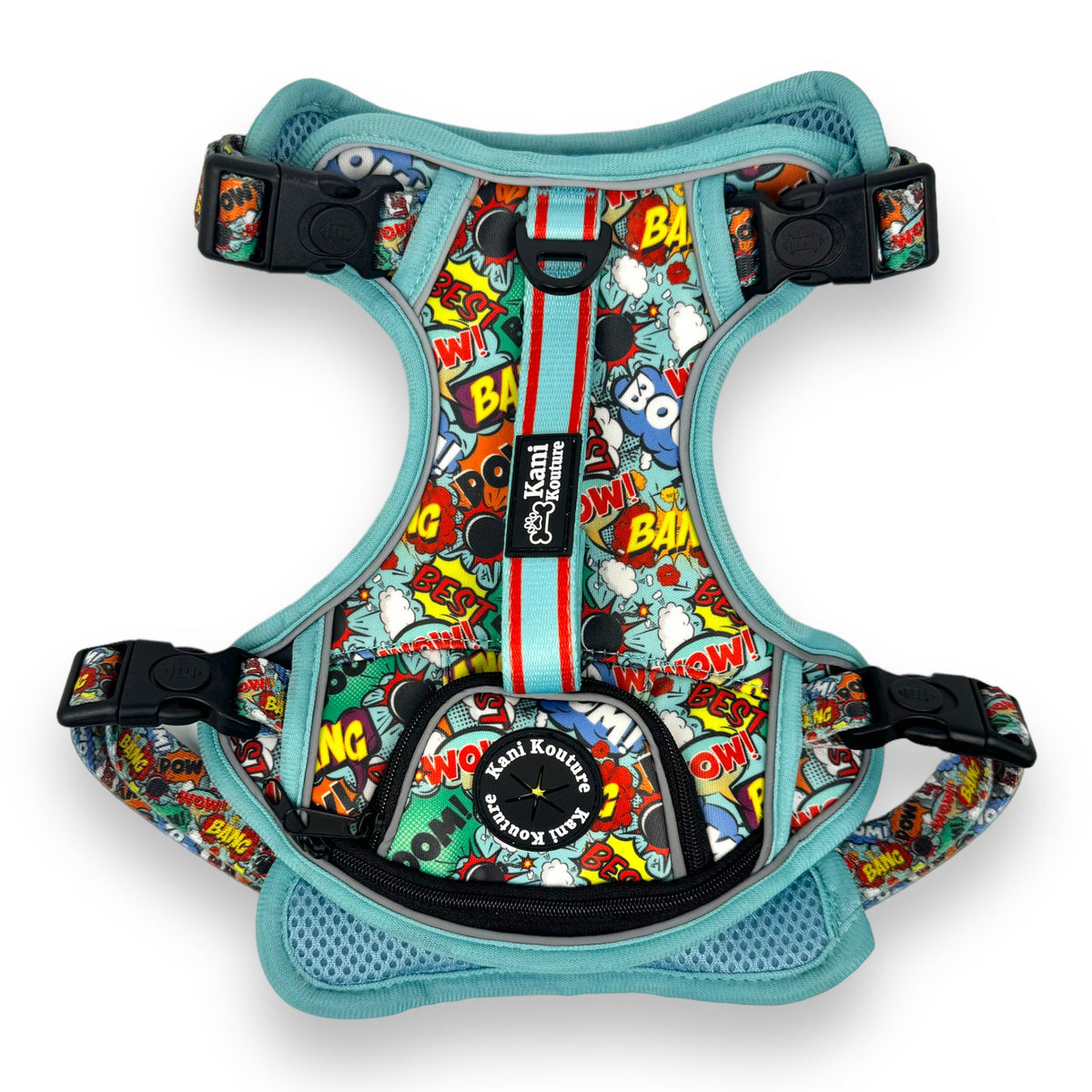 Unleash the superhero within your pup with our Boom POW Bang Collection. Comic book action words adorn a light blue background, adding a vibrant and playful touch to their accessories. Let your dog's style make a powerful statement!